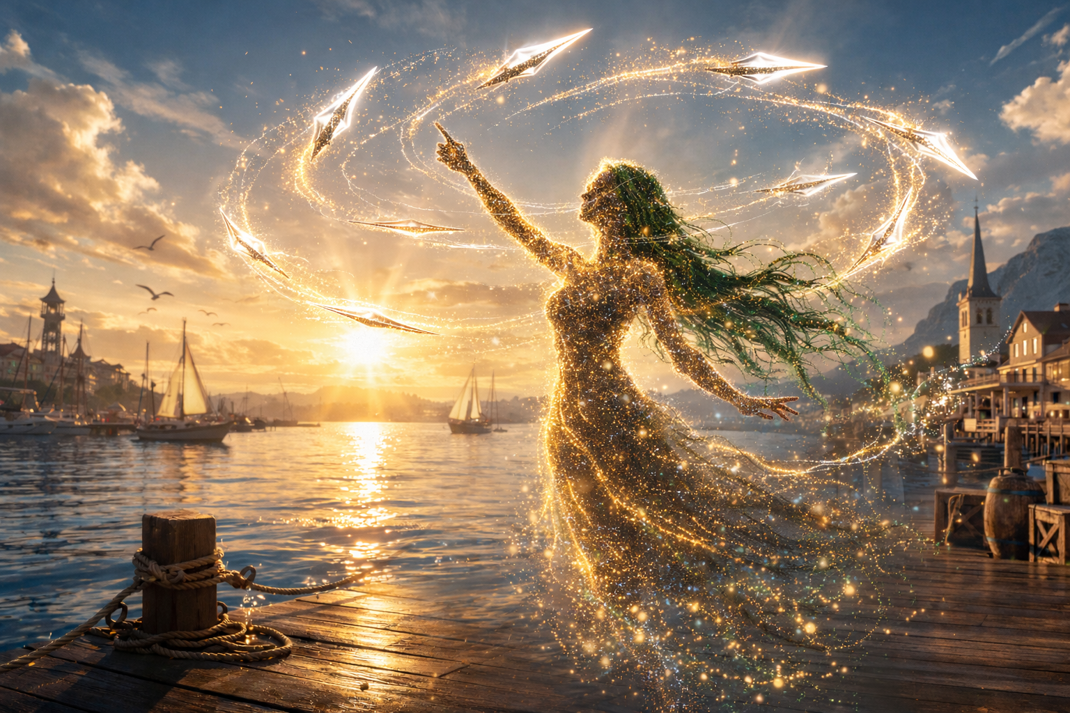 Cover note: For this batch, I picked Prototype WEAVE Weapons: a golden, glittering silhouette on a dock at sunset, with a ring of bright, blade-like shapes orbiting like a spell you can almost hear humming. It fits this batch’s energy: playful prototyping, with enough sharp edges to remind you it still needs real guardrails.